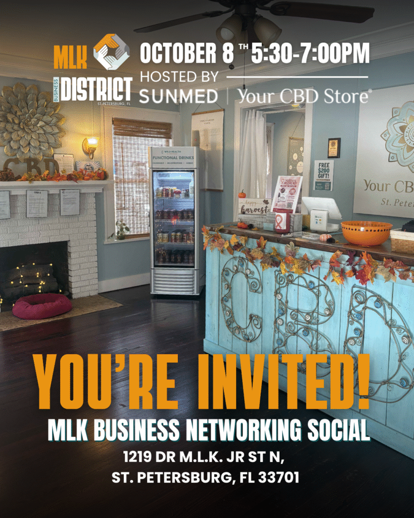 The MLK Business District is kicking off our October Networking Social at SUNMED | Your CBD Store St. Petersburg on Wenesday, October 8th at 5:30-7PM.