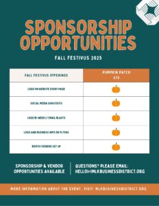 Show your support for the community while getting your business noticed! As a Pumpkin Patch Sponsor, your logo will be featured on the MLK website event page, plus you’ll receive shoutouts on social media and mentions in our bi-weekly email blasts. You’ll also have the opportunity to set up a booth at the event (just bring your own table, chairs, and décor).